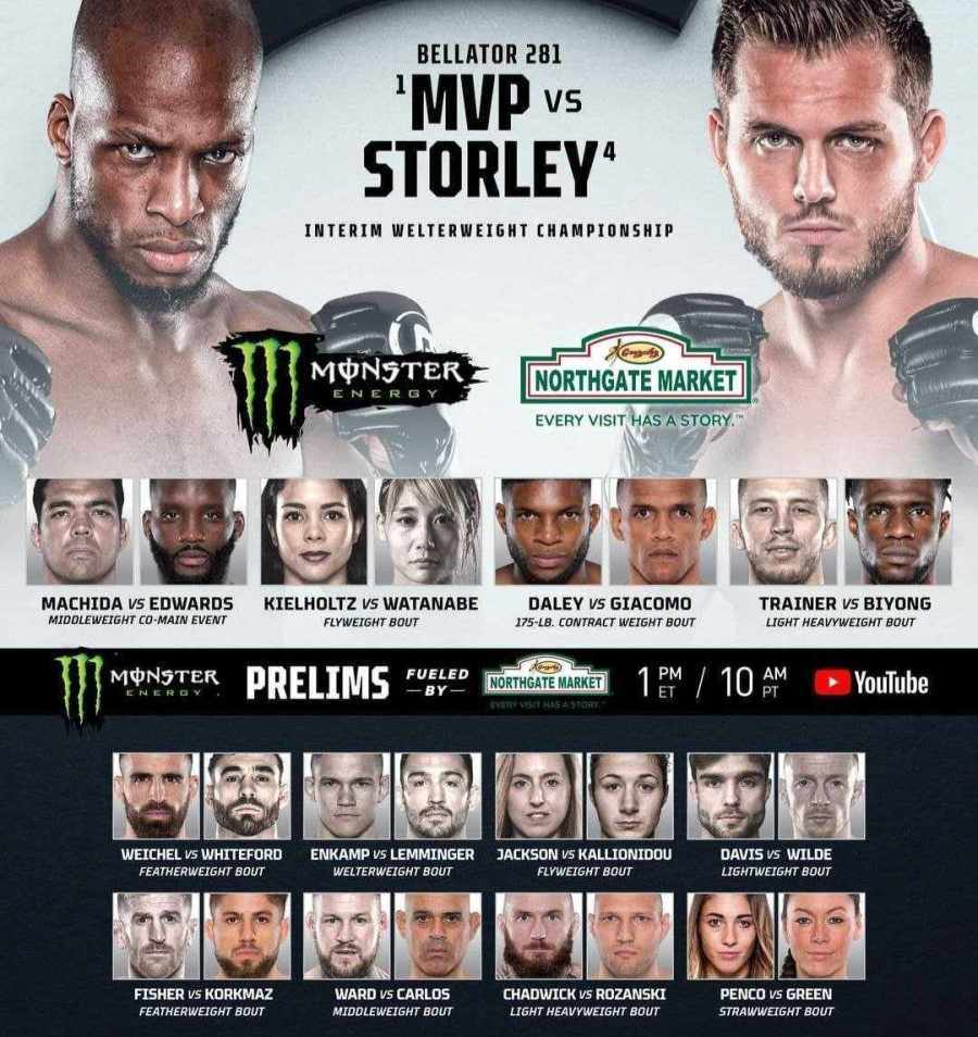 Bellator 281: «MVP vs. Storley» состоится сегодня (пятница, 13 мая 2022 г.) в Лондоне, Англия, и будет посвящен промежуточному титульному бою в полусреднем весе между Майклом Пейджем и Логаном Сторли. Также в этом карде Пол Дейли проведет свой прощальный бой в смешанных единоборствах (ММА), где сразится с Венделлом Джакомо. Прямой эфир Bellator 281 Пейдж - Сторли начнется в 20:00 по МСК.Полный кард Bellator 281. Участники турнира