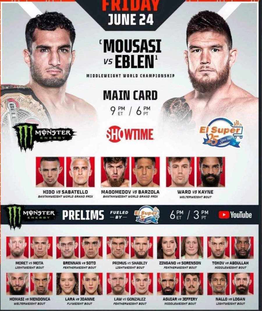 Основной кард Гегард Мусаси против Джонни Эблена за титул Мусаси в Bellator в среднем весе Леандро Хиго против Дэнни Сабателло; легчайший вес Магомед Магомедов против Энрике Барзола; легчайший вес Бреннан Уорд против Кассиуса Кейна; полусредний вес Предварительный кард Брент Примус против Александра Шаблия; Легкий Кэт Зингано против Пэм Соренсон; Женщины, полулегкий вес Анатолий Токов Мухаммад Абдулла; средний вес Сабах Хомаси vs. Майкон Мендонка; полусредний вес Алехандра Лара против Илары Джоанн; Женский наилегчайший вес Коди Ло против Джеймса Гонсалеса; Легкий вес Дэн Морет vs. Киллис Мота; Легкий Лукас Бреннан против Джонни Сото; Легкий вес Аарон Джеффери против Фабио Агияра; средний вес Брайс Логан против Манделя Налло; Легкий Маркус Брено против Ричарда Паленсии; Легчайший вес