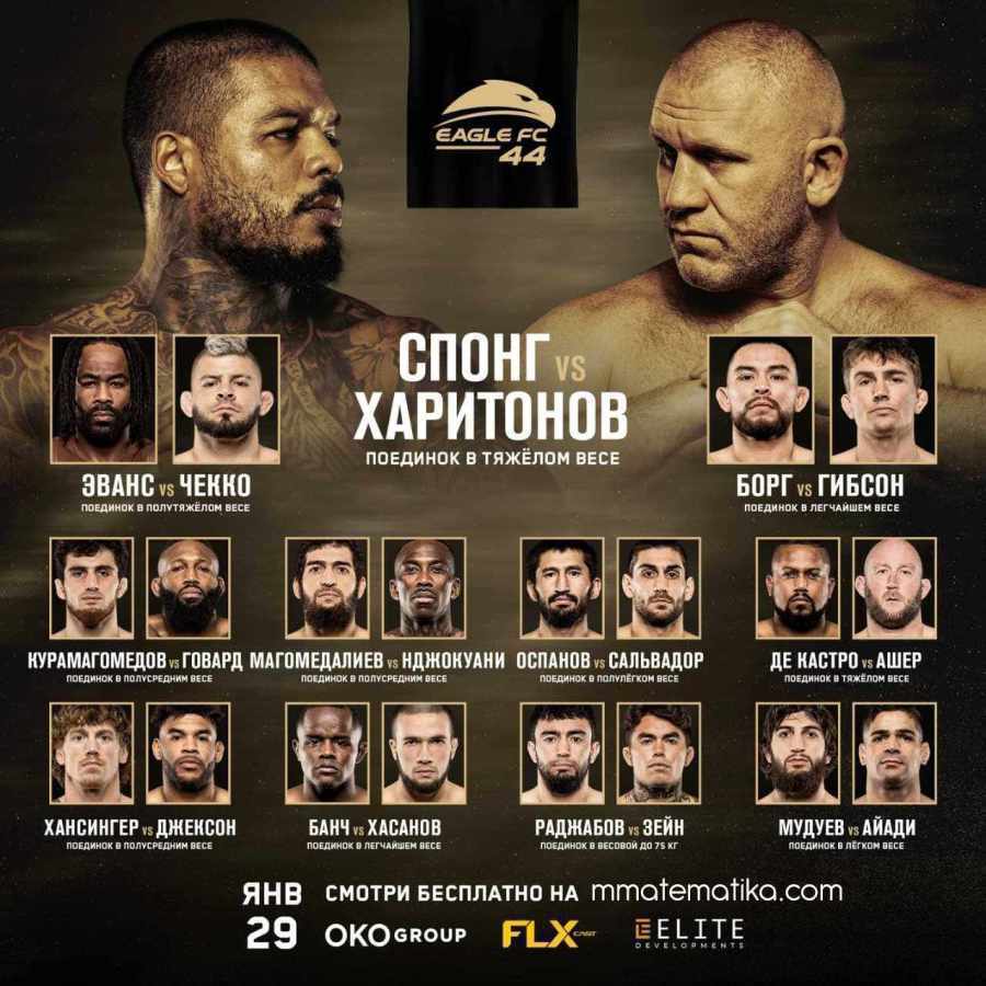 EFC 44 - Харитонов - Спонг, — турнир по смешанным единоборствам, организованный Eagle Fighting Championship, который пройдет 28 января 2022 года в спортивном комплексе «FLX» в городе Майами, штат Флорида, США. В главном бою вечера Сергей Харитонов встретится с Тайрон Спонг. В качестве заглавного события турнира запланирован бой в полутяжелом весе между Рашад Эванс и Габриэль Чекко ❌ Даррелл Хорчер выбывает с поединка, на замену Лоику Раджабову выйдет Зак Зейн из США Онлайн прямой эфир Eagle FC 44 начнется в 02:00 по МСК.Полный кард и участники турнира EFC 44 Харитонов vs. Спонг