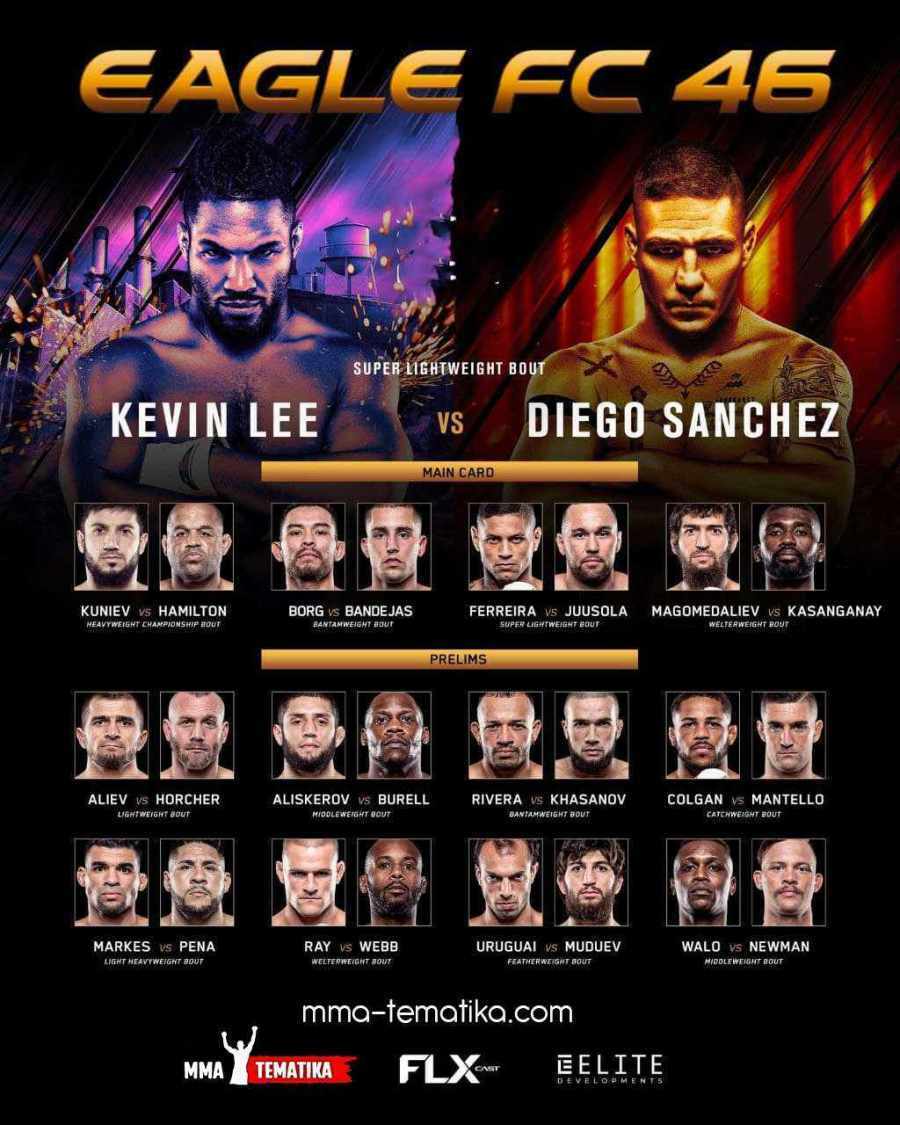 Главный бой Кевин Ли (США, 18-7) — Диего Санчес (США, 30-13) Основные поединки Импа Касанганай (США, 9-2) — Раймонд Магомедалиев (Россия, 9-1) Хэндессон Феррейра (Бразилия, 17-3-1) — Зак Джуусола (США, 12-7) Рэй Борг (США, 15-5) — Рикки Бандежас (США, 15-6) Ризван Куниев (Россия, 10-2-1) — Энтони Хэмилтон (США, 18-10). Бой за титул чемпиона Eagle FC в тяжелом весе Предварительные поединки Эммануэль Вало (США, 14-4-1) — Райдер Ньюмен (США, 3-1) Кайо Роча Уругвай (Бразилия, 8-4) — Ситик Мудуев (Россия, 10-3) Томас Уэбб (США, 14-6) — Тайлер Рэй (США, 9-2) Регги Пенья (США, 15-6) — Ронни Маркес (Бразилия, 21-9) Арчи Колган (США, 3-0) — Дилан Мантелло (США, 4-1) Ирвин Ривера (США, 10-6) — Фирдавс Хасанов (Узбекистан, 6-3) Икрам Алискеров (Россия, 11-1) — Нах-Шон Баррел (США, 19-11) Ахмед Алиев (Россия, 20-7) — Даррелл Хорчер (США, 14-5)