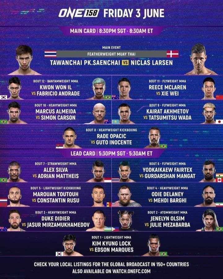 ONE 158: Tawanchai vs. Larsen состоится в прямом эфире днем 3 июня 2022г в Калланге, Сингапур, и mma tematika предоставляет вам полную информация про кард!Прямой эфир ONE 158 начнется в 13:00 по МСК.