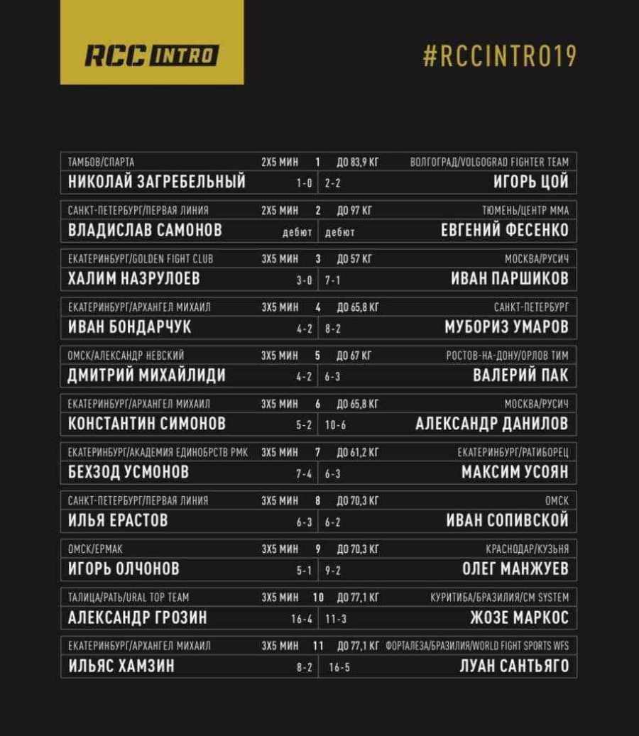 Полный кард и участники турнира RCC Intro 19 Хамзин vs. Сантьяго