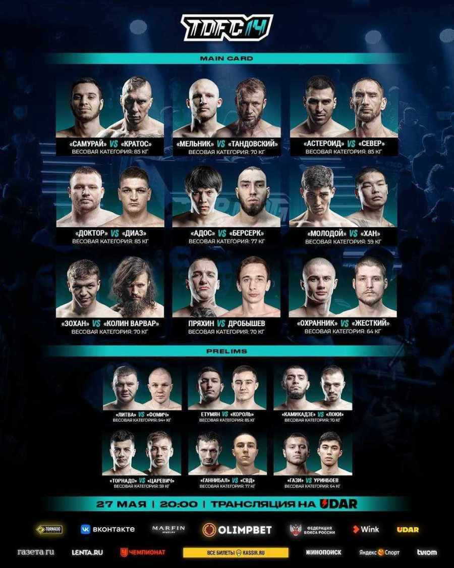 TDFC 14: Самурай vs. Кратос состоится в прямом эфире вечером 27 мая 2022г на волейбольной арене «Динамо» в Москве, и mma tematika предоставляет вам полную информация про кард! В главном событии турнира чемпион среднего дивизиона Наим Самурай Давудов проведет поединок с непобежденным Сергеем Кратосом Калининым. В со-главном бою встретятся легковесы Алексей Мельник Мельников и Иса Тандовский Исаев. Правила боев Top Dog: — 3 раунда по 2 минуты; — бой проходит без перчаток; — никакой борьбы в партере, ударов ногами и локтями; — допускаются удары из клинча; — после нокдауна у бойца есть 10 секунд, чтобы подняться; — возможна ничья. Прямой эфир Top Dog FC 14 начнется в 20:00 по МСК.Top Dog FC 14: Полный кард и участники турнира