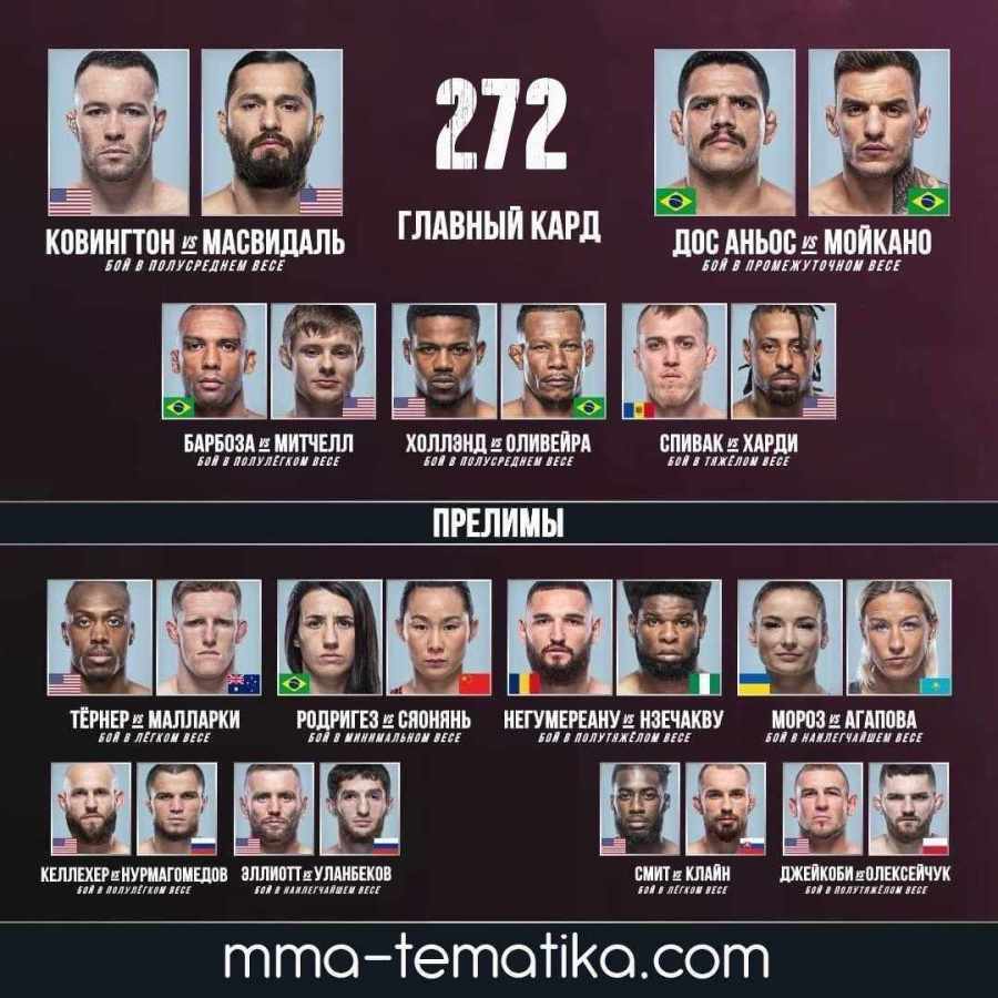 UFC 272: Ковингтон vs. Масвидал — турнир по смешанным единоборствам, организованный Ultimate Fighting Championship, который пройдет 5 марта 2022 года в спортивном комплексе «T-Mobile» в штате Невада, город Лас-Вегас. Этой ночью произойдет крупное столкновение в UFC. И этому бою даже не нужен титул на кону, чтобы привлечь людей, поскольку полусредневесы Колби Ковингтон и Хорхе Масвидаль надеются свести счеты в своем ожесточенном соперничестве на UFC 272 на T-Mobile Arena в Лас-Вегасе. Ковингтон потерпел два поражения в последних трех матчах от нынешнего короля дивизиона Камару Усмана, но он явно был противником, который доставил Усману больше всего проблем за время его чемпионства. Он достиг статуса временного чемпиона на фоне серии побед из семи боев, в которых он доминировал над такими соперниками, как Демиан Майя, Рафаэль Дос Аньос и Робби Лоулер. Масвидаль, тем временем, тоже проигрывает Усману, последним из которых стал сокрушительный нокаут. Это поражение остановила его невероятную серию побед, когда Gamebred одержала три досрочные победы над Дарреном Тиллом, Беном Аскреном и Нейтом Диасом. На этом турнире также проведут бои: Колби Ковингтон, Хорхе Масвидаль, Рафаэль Дос Аньос, Эдсон Барбоза, Сергей Спивак, Мария Агапова, Марина Мороз, Умар Нурмагомедов, Тагир Уланбеков, Михал Олексийчук Онлайн прямой эфир UFC 272 начнется в 02:00 по МСК.Полный кард и участники турнира UFC 272 Ковингтон vs. Масвидал