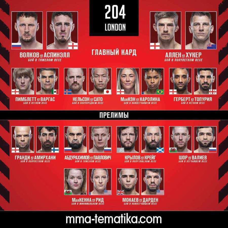 UFC Fight Night 204: Волков vs. Аспиналл — турнир по смешанным единоборствам, организованный Ultimate Fighting Championship, который пройдет 19 марта 2022 года в спортивном комплексе «Арена О2» в Англии, город Лондон. В главном бою вечера Александр Волков встретится с Том Аспинэлл . В качестве заглавного события турнира запланирован бой в легком весе между Дэн Хукер и Арнольд Аллен На этом турнире также проведут бои: Шамиль Абдурахимов, Сергей Павлович, Никита Крылов, Илия Топурия, Тимур Валиев, Мухаммад Мокаев Онлайн прямой эфир UFC Fight Night 204 начнется в 20:30 по МСК.Волков - Аспиналл: Кард и участники турнира UFC London
