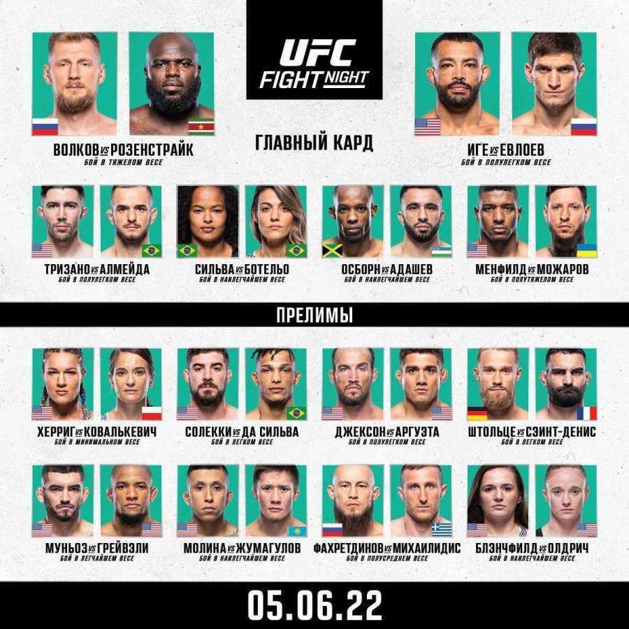 UFC VEGAS 56: Волков vs. Розенстрайк состоится в прямом эфире вечером 4 июня 2022г на UFC Apex Арена в Лас-Вегасе, и mma tematika предоставляет вам полную информация про кард! Кард боев UFC Vegas 56 возглавлит бой в супертяжелом весе между Александром Волковым и Жаирзиньо Розенстрайком. Волков (34-10) — один из самых опытных бойцов-тяжеловесов в мире. Он бывший чемпион Bellator и в настоящее время занимает 7-е место в рейтинге тяжеловесов UFC. Розенструйк (12-3) занимает 8-е место в дивизионе. Оба бойца оправляются от поражений и хотят встряхнуться в верхней части самой тяжелой весовой категории UFC. Это интересный поединок, в котором Волков пользуется большим уважением, чем Розенстрайк, за свои боевые приемы, но оба обладают нокаутирующей мощью в супертяжелом весе. В со-главном событии состоится ключевой бой в полулегком весе между Дэном Иге и Мовсаром Евлоевым. Иге (15-5) и Евлоев (15-0) соревнуются за высокие позиции рейтинга в полулегком весе. Иге уже давно укрепился в рейтингах, но каждый раз, когда он пытался вмешаться в борьбу за титул, ему не очень везло. Евлоев непобедим, но Иге — его ступенька в десятку лучших. Так же в этом карде Алонзо Менифилд против Аскар Можаров, Заррух Адашев против Оде Осборн, Джефф Молина против Жалгас Жумагулов, Ринат Фахретдинов против Андреас Михайлидис Прямой эфир UFC VEGAS 56 начнется в 20:00 по МСК.UFC VEGAS 56: Полный кард и участники турнира
